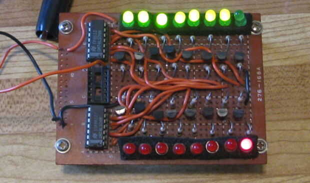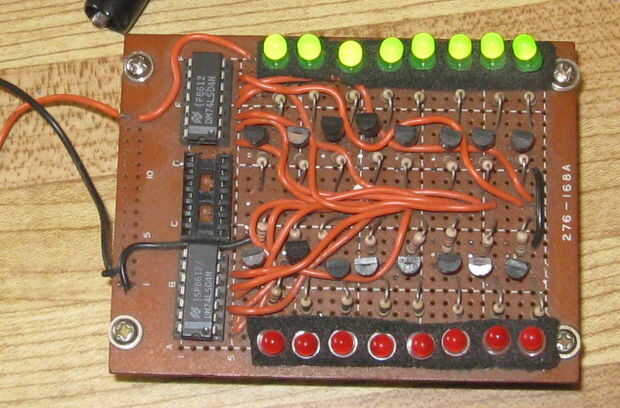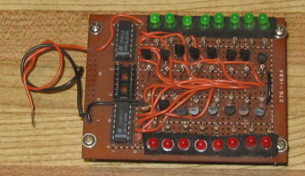 Cuando las entradas están conectadas a un circuito o apague el LED verde de la tierra y el rojo LEDs se iluminan indicando baja o 0 binarios.