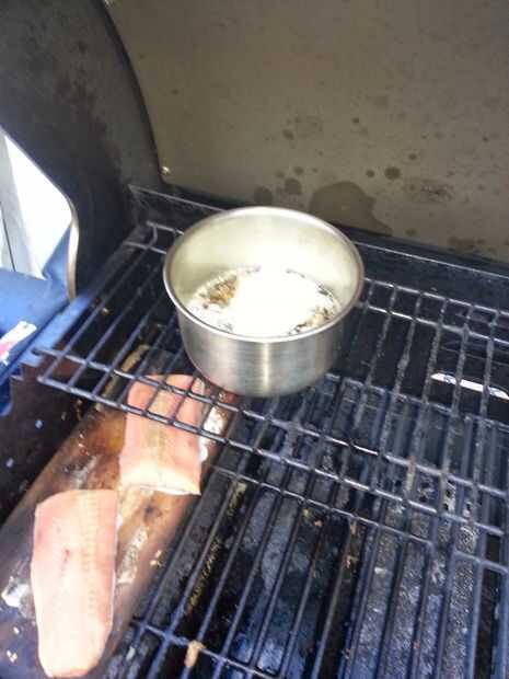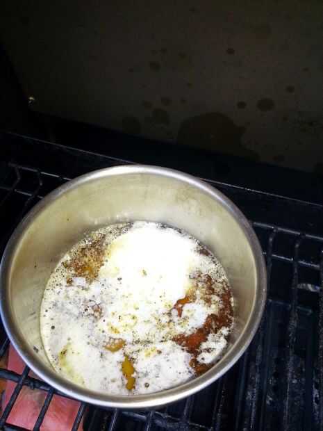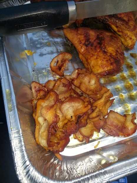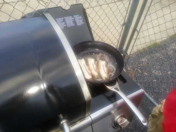 Coge la otra mitad de tocino y freír hasta. Utilizamos un quemador lateral, pero puede utilizar una estufa o un sartén sobre la parrilla.