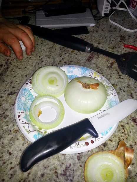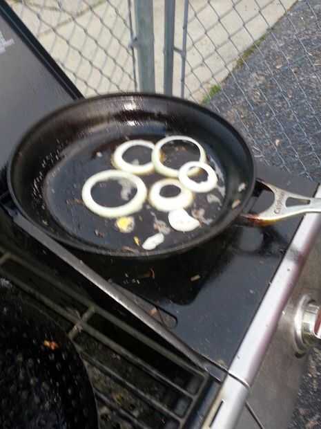 Cortar la cebolla dulce en anillos y una vez hecho el tocino cocinar, arrojarlos en la grasa de tocino durante un minuto o dos para ablandarlas para arriba y agregar un poco crujiente en los bordes. Poner ellos y el tocino en algunas toallas de papel para drenar.