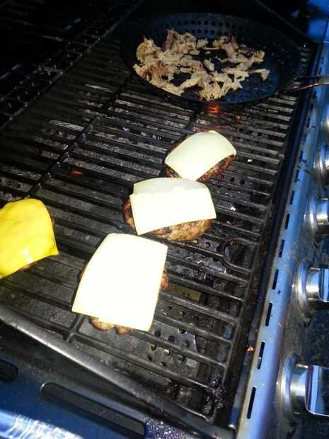 Después se realiza la primera parte y las hamburguesas se girarán para el último momento, esperar un minuto o dos y lanzar en su queso de elección. Fuimos con tres Muenster y un americano, también, alguien no quería queso. Los burlaba horriblemente. Esperemos que aprendieron su lección.