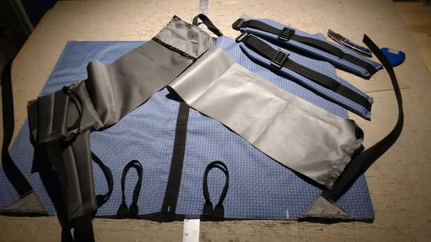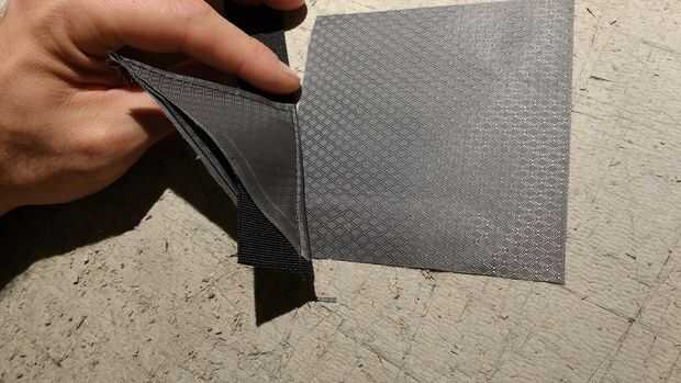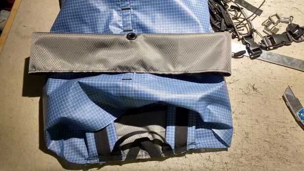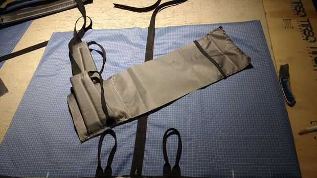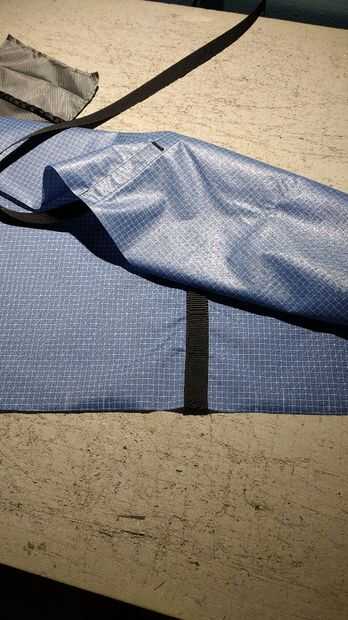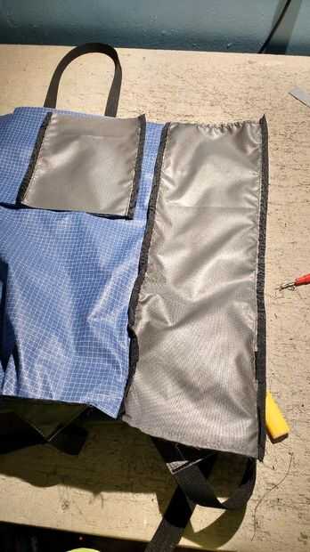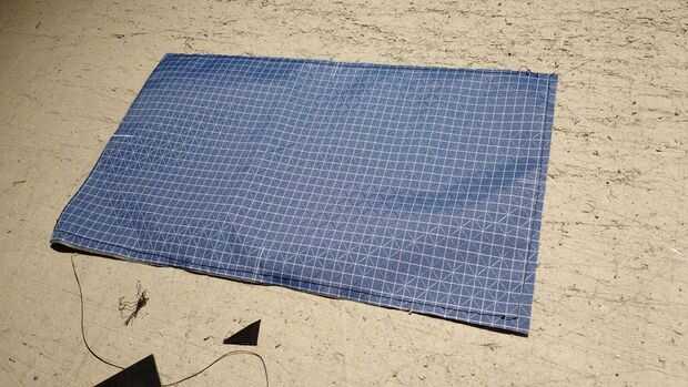 Doblar las dos plazas de no-dyneema sobre un triángulo y luego sobre otra vez en otro triángulo más pequeño, coloque cinta en el segundo doblez y cosen a lo largo de borde (ver foto), virar a enfrentarse con las correas laterales tocando cuadrante marca (como la foto pero un poco más cerca del centro).
