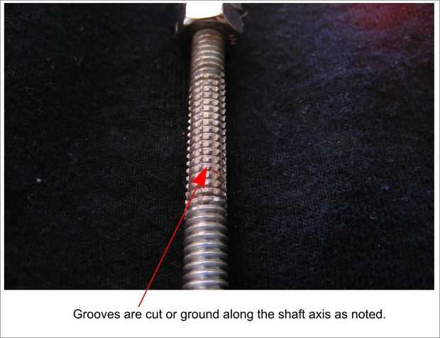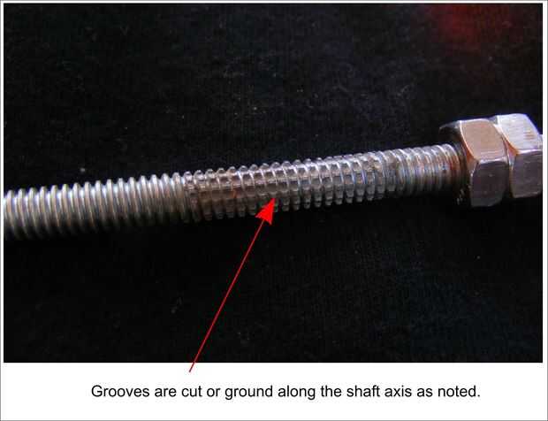Imágenes 4 y 5 muestran la varilla roscada y cómo ha sido ranurado.  Esto se hace simplemente poniendo un disco de corte dremel en el taladro pequeño y cortar ranuras cada 30 grados, o cerca de 12 ranuras.