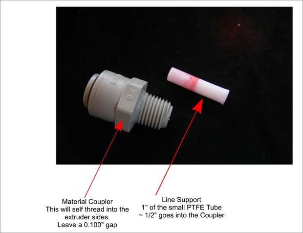 Cortar 1" pieza de la tubería de PTFE que se utilicen para el fin de caliente y lo coloca en el acoplador de 1/2 manera.  Esto evitará que material más pequeño doblez como se ha mencionado, no es necesario tocar hilos de rosca en el cuerpo de Nylon.  Simplemente empuje y giro el acoplador en la apertura y los hilos de rosca se y luego atornille el resto del camino, dejando sobre 0,100" diferencia.
