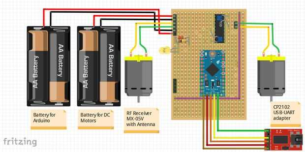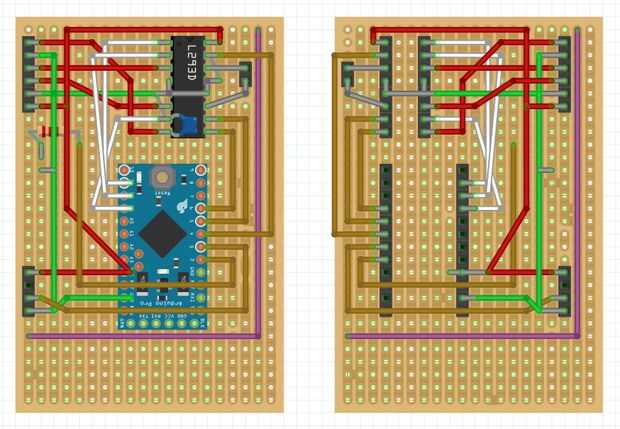 Yo entonces cambiado de puesto a la planificación del cableado en Fritzing. Las cosas han mejorado pero también he descubierto algunas de las limitaciones de Fritzing (sorprendentemente, mi elemento Mini-Pro en Fritzing no coincide con el 1/10" perno espaciamiento de la Junta, mi versión no crear simetrías y por lo tanto modelar la parte posterior del PCB no es automática, la creación de nuevos elementos no es en absoluto evidente, representación es lenta,...).