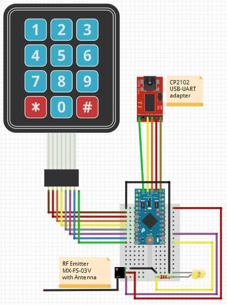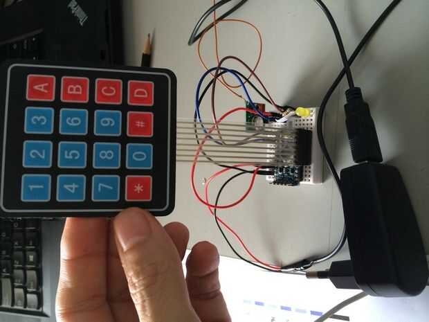 A diferencia con el infrarrojo, con su agradable el dispositivo del estante, para el RC tuve que crear mi propio controlador... Usé una almohadilla de membrana de 4 * 4 conectada a otro protoboard pequeño Mini-Pro alimentado por un adaptador de corriente USB. Los alfileres de la almohadilla son muy cortos, por lo que se está moviendo hacia fuera cada vez...
