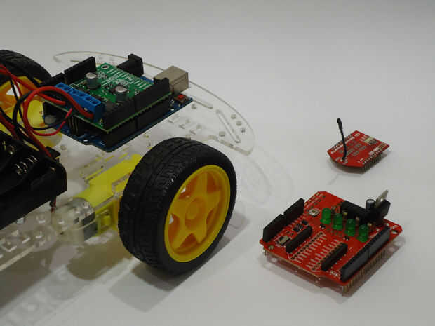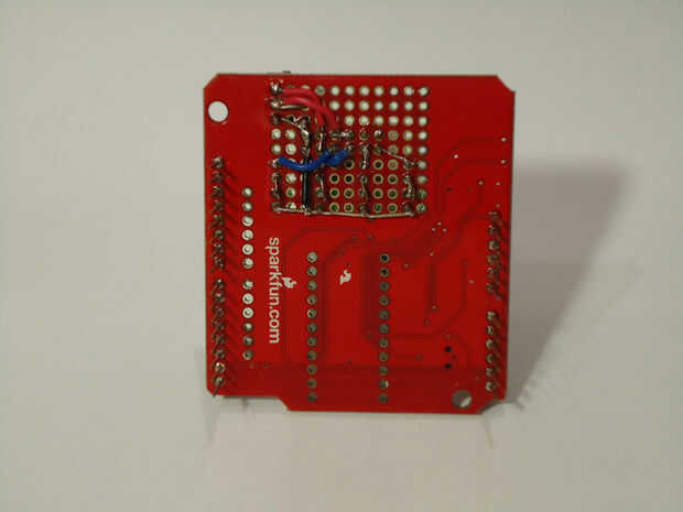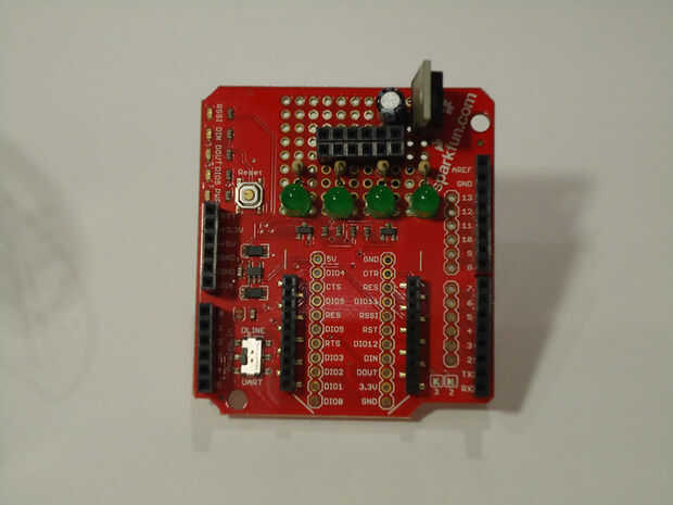 Si no quieres soldar los LEDs y el regulador de tensión en el XBee shield, usted puede montar en un pequeña protoboard como se muestra en el diagrama anterior. En este caso, elige una placa de reducido tamaño para que usted puede arreglarlo en algún lugar en el chasis sin más problemas.