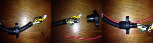 Quitar el mitigador de la tensión desde el lugar del cable el cable de 12gauge individuales paralelo a la médula. Aplicar algún lubricante alambre y tiró el mitigador de la tensión sobre el cable y el alambre 12gauge, es un ajuste apretado.