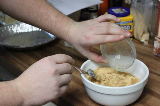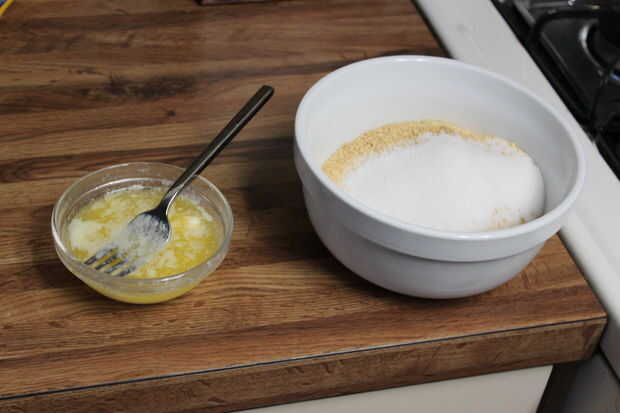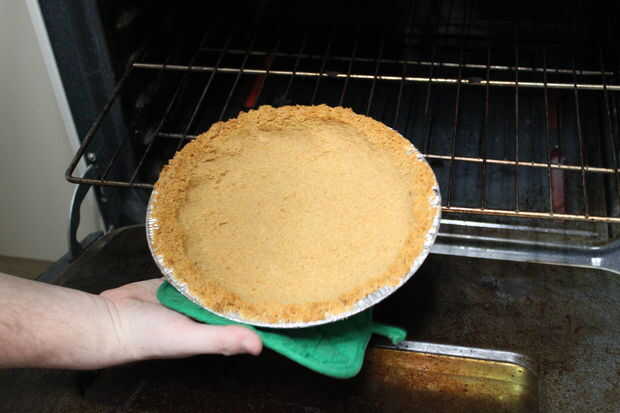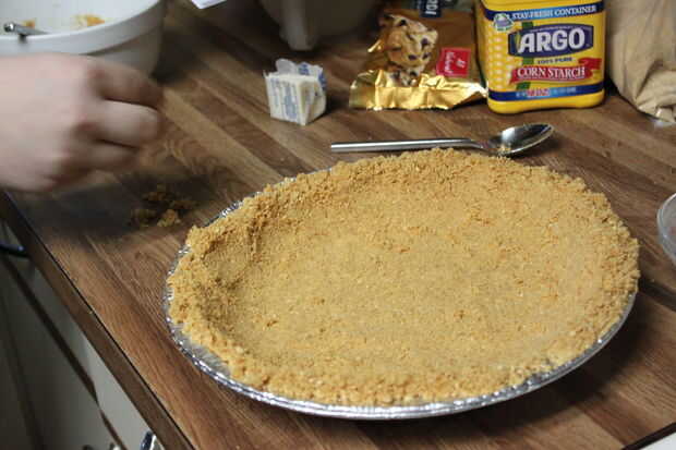 Combinar el azúcar y las migas en un bol de tamaño mediano para que se mezclan bien. Derretir la mantequilla y mezcla para que toda la mezcla se mezcla completamente. Puse toda la mezcla de galleta en una de las bandejitas de 10 pulgadas. Con una cuchara, Esparza la mezcla uniformemente contra el conjunto dentro de la lata, incluyendo los lados y compacta la mezcla (como en la imagen). Poner la tarta en el horno durante 8 a 10 minutos a 350F. Una vez hecho, deje que se enfríe luego enfriar mientras prepara el resto de la tarta.