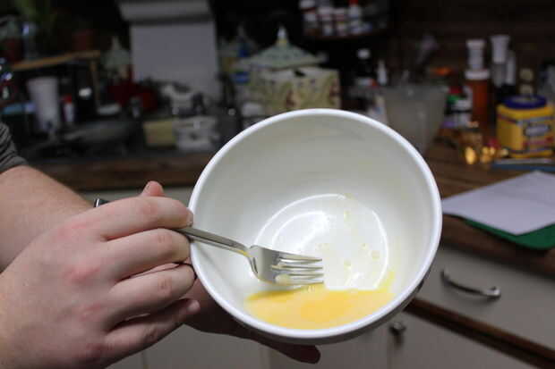 A continuación, romper el huevo en un recipiente y batirlo bien hasta que la luz amarilla. Añadir ambos azúcares al huevo y mezclar. Luego agregar el resto de los ingredientes, mezclándolos completamente para hacer la masa. Vierta la mezcla en el centro de la sartén con mantequilla y enharinado. Espárcelo de forma pareja en un disco cubriendo la mayor parte de la parte inferior de la cacerola (uso foto para referencia.)