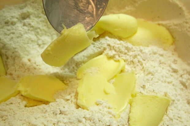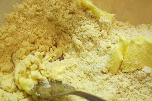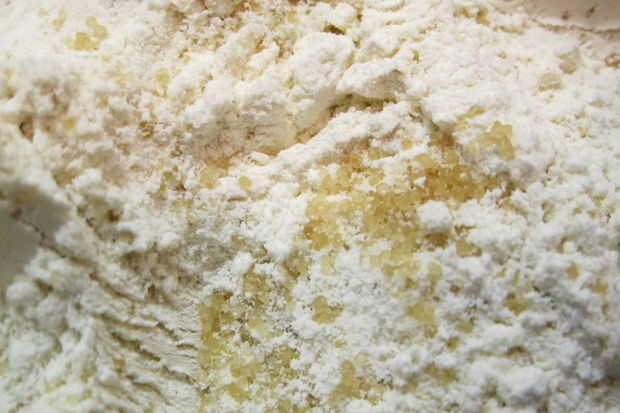 3. proceso de la mantequilla hasta lo mezclas bien en la harina. Masa sólo comienza a agruparse en pequeños pedazos.