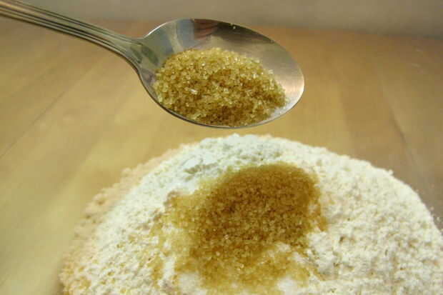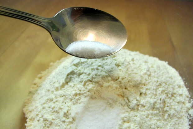 1. mezcla 1 1/2 tazas de harina, sal y azúcar hasta combinar.