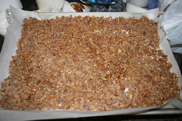 Distribuida uniformemente en la bandeja para hornear y poner en el estante medio del horno durante 1 hora.