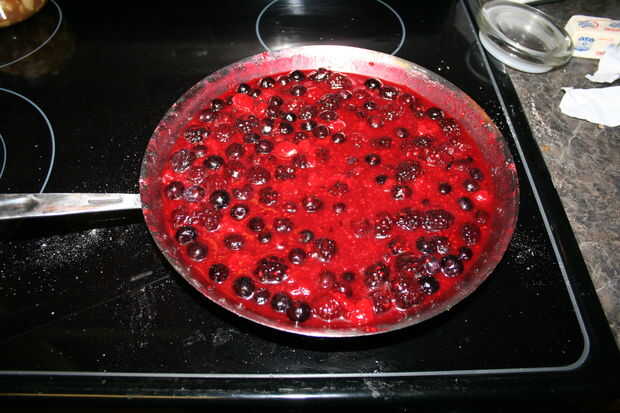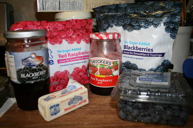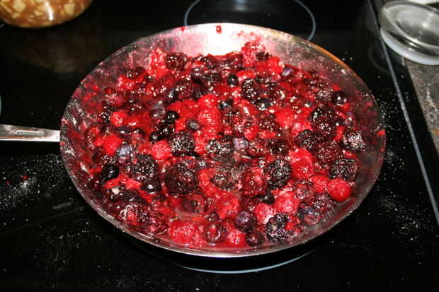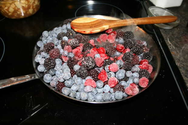 Agregue las bayas congeladas primero y dejado caliente mientras se mezclan los ingredientes secos en un recipiente separado.