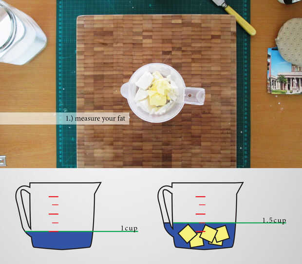 Coloque la taza de agua en una jarra medidora y añada media taza de grasa.