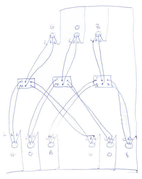 G, O, B reposar verde naranja y negro, los tres canales, y L, R, G soporte para izquierda, derecha y tierra. Las cosas en el medio son tres interruptores DPDT (doble polo, doble tiro), que básicamente le permiten tomar dos conjuntos de 2 entradas de contacto y Únete a una salida.