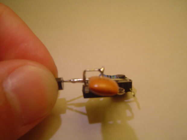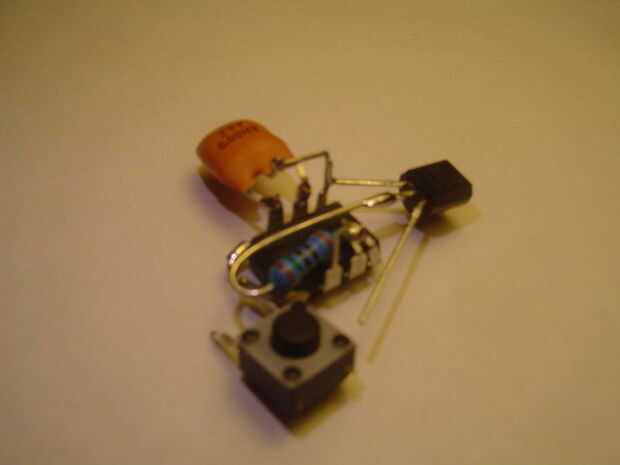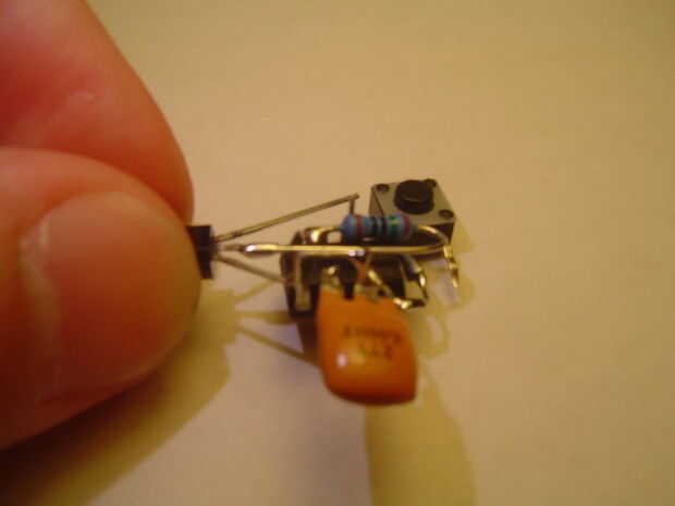 Doblar las dos clavijas exteriores del resonador hacia adentro y hacia arriba el pasador interno. Soldar las los dos exteriores a los pines 2 y 3 del microcontrolador. Inclinarse el cable sobrante del emisor del transistor y soldar al pin central del resonador para conectar a tierra.