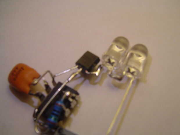 Soldar el cable de negativo de sus LEDs al colector del transistor y deja el positivo apuntando hacia el lado como se muestra.