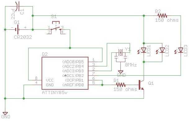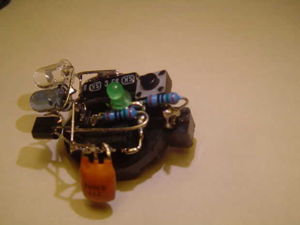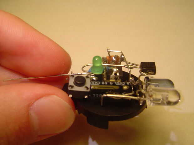 En primer lugar, tomar su LED y doble positivo (no en el lado plano) hacia afuera. Mantenga el cable negativo (con un lado plano) hacia la misma dirección y cortar para que sea unos 3mm de largo. Soldar al pin 7 del microcontrolador, con el positivo hacia el interruptor.