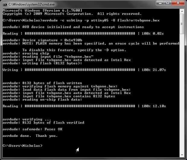 Descargar el firmware v1.1 de Ladyada.net en http://ladyada.net/media/tvbgone/tvbgone11.zip. Esto es para su equipo, pero la usé para programar esto y funcionó. Descomprimir la carpeta y busque el archivo tvbgone.hex. Copiar esto y poner en C:\users\username donde puede encontrar AVRdude. Ahora, en AVRdude, tipo