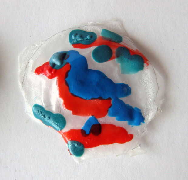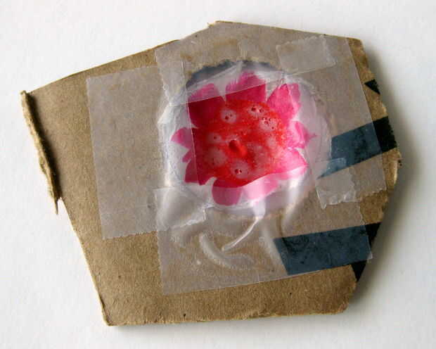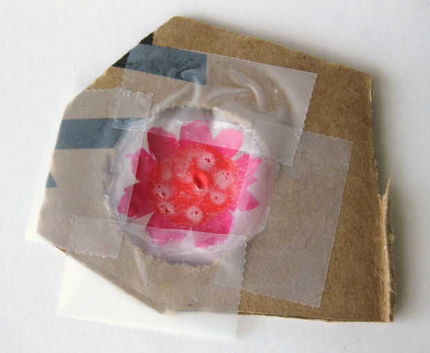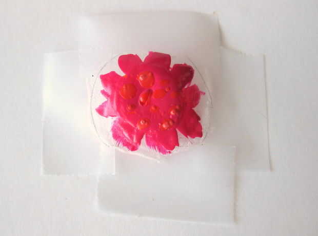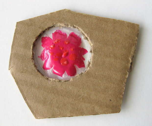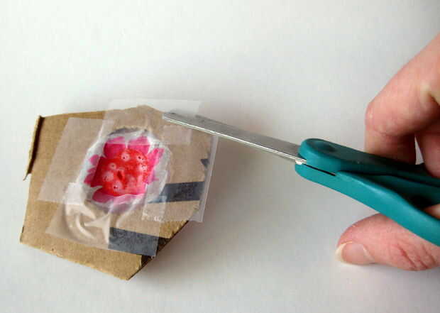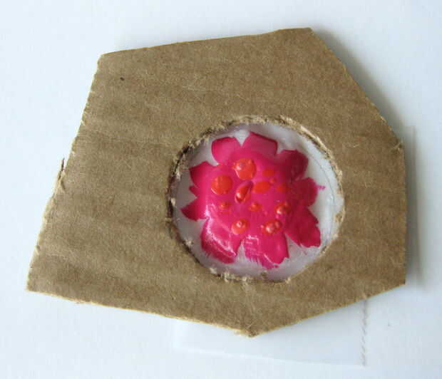 Palillo de la pintura en la parte posterior de uno de los marcos. (Este sería el lado con cualquier marcas en él.) Asegúrese de que la pintura está perfectamente delineada por la abertura circular en el marco. Utilizar tijeras para recortar distancia cualquier cinta que pasa por el marco de cartón.