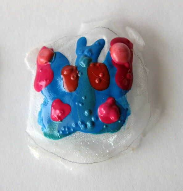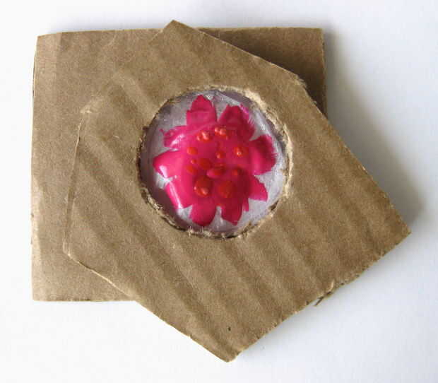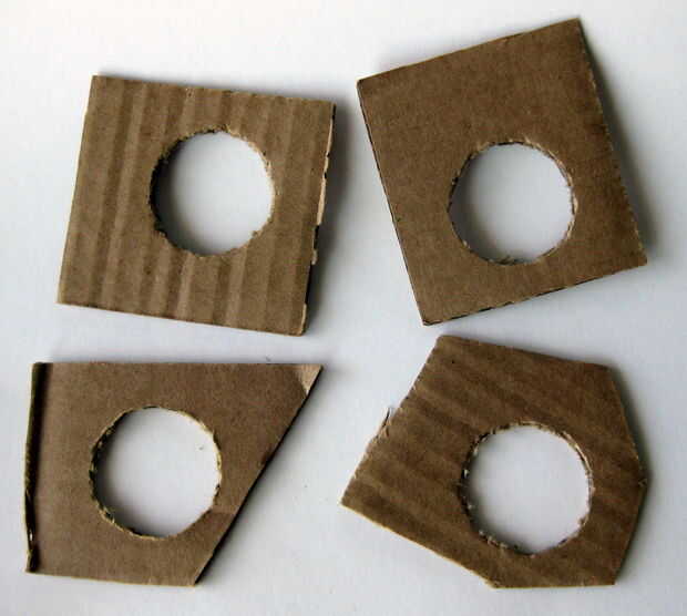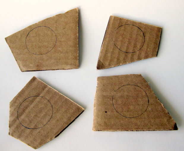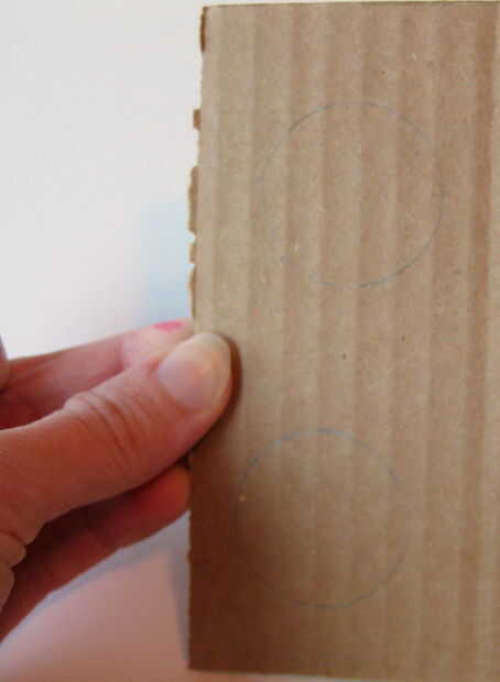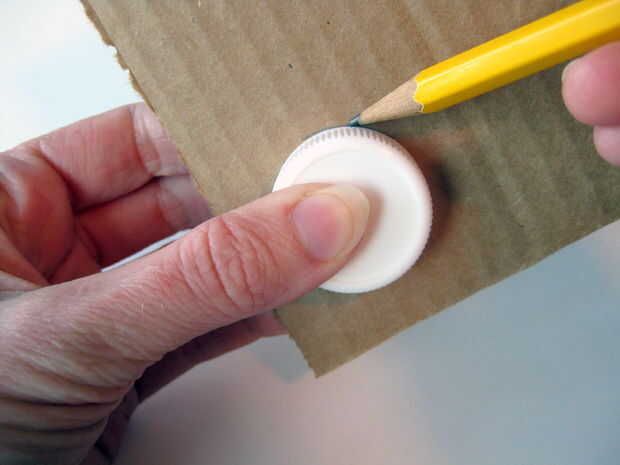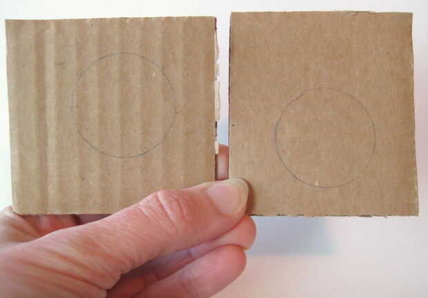 Utilice la tapa de la botella y un lápiz para hacer contornos circulares sobre pedazos de cartón. Luego cortar el área alrededor del círculo, como cortando un cuadrado alrededor del círculo. Ver las fotos para ver ejemplos. He encontrado que hacer marcos angulares, asimétricos alrededor de los círculos parecía agradable. Hacer dos marcos de cartón para cada cuadro, se va intercalando la pintura entre ellos.