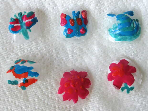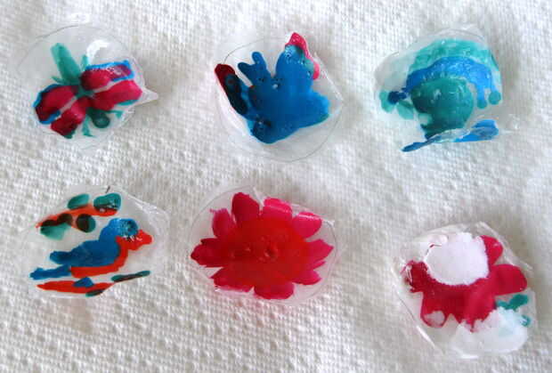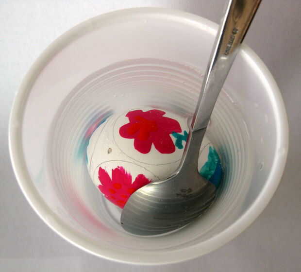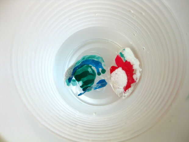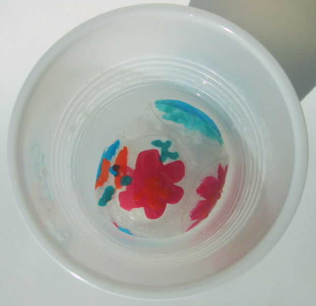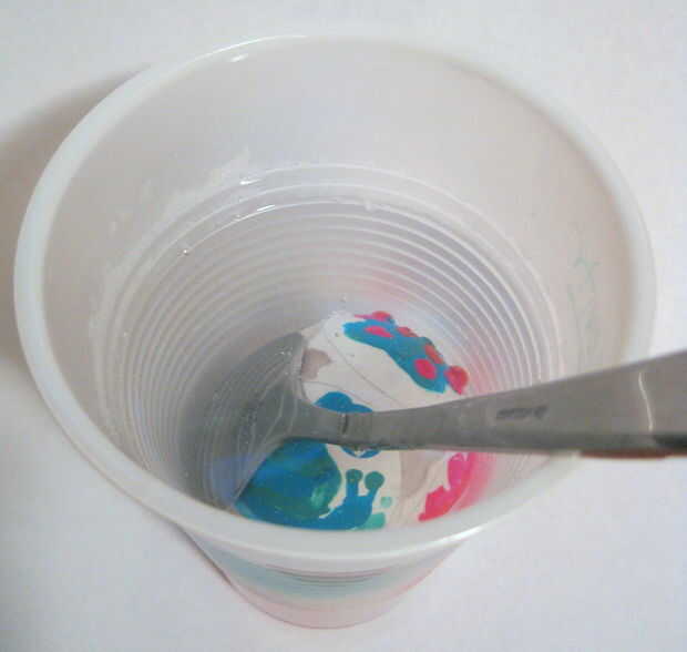 Después de las 48 horas adicionales, la cáscara del huevo debe ser totalmente disuelta. Sacar con cuidado las piezas pintadas y enjuagar suavemente con agua para quitar el vinagre y residuos de huevo. Si los trozos todavía tienen algunos shell adjunta (2 de mis 6 lo hizo), ponerlos en una nueva taza de vinagre para otro 24 horas y todos los de la cáscara debe ser entonces desaparecido.