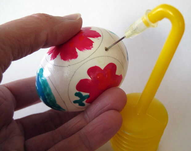 Sumergir el huevo en una taza de vinagre durante 24 horas. Para sumergir el huevo, puede utilizar el soplador de huevo para poner un poco de vinagre en el huevo y utilizar una cuchara para sostener el huevo hacia abajo.