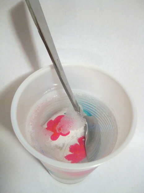 Después de que se seque totalmente, el huevo está listo para ser empapado en vinagre. Esto disolverá la cáscara (específicamente, el carbonato de calcio en la cáscara se disolverá al reaccionar con el vinagre ácido, haciendo burbujas de dióxido de carbono en el camino), pero dejará intacto el esmalte de uñas. Usted lo dejó con sus dibujitos, hechas completamente de esmalte de uñas!