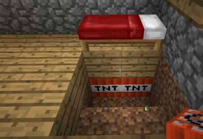 En primer lugar, Cave un agujero de 2 por 2 debajo de la cama como tal en las 2 fotos superiores del agujero. Luego, llenar el agujero de 2 por 2 con 1 capa de TNT. Luego, cavar un túnel de 3 bloques como tan en el cuadro 4, luego cavar 5 cuadras más como en el cuadro 5.