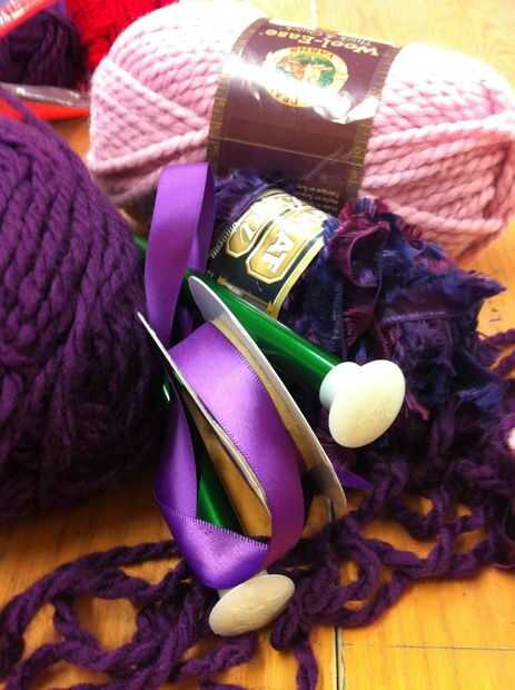 tres hilados de selecciones, utilicé lana gruesa de fácil y rápida, "la flor" un poco menos voluminoso "púrpura oscuro" y algo llaman Bernat Boa, "loro" se parece a un filamento muy largo de pestañas! grandes agujas, usé tamaño 17 aguja de zurcir cinta
