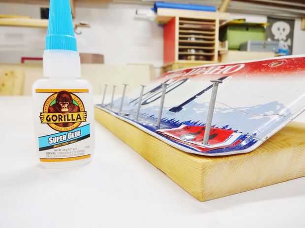 Puse una gota de pegamento en cada agujero del clavo, y luego los clavos fueron golpeados suavemente en su lugar.