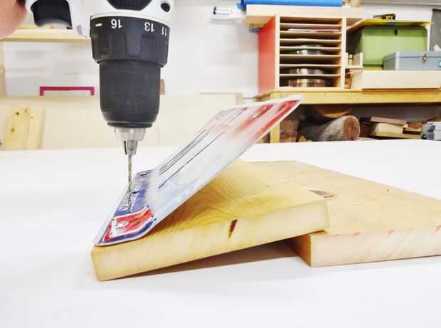 Apuntalado la Junta a lo largo del borde posterior y mi taladro rectamente posible y perforado hacia abajo en la madera por los agujeros hechos previamente en la placa. Tenga cuidado de sólo perfore la madera 3/4 del camino y no a través.