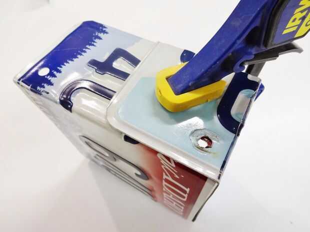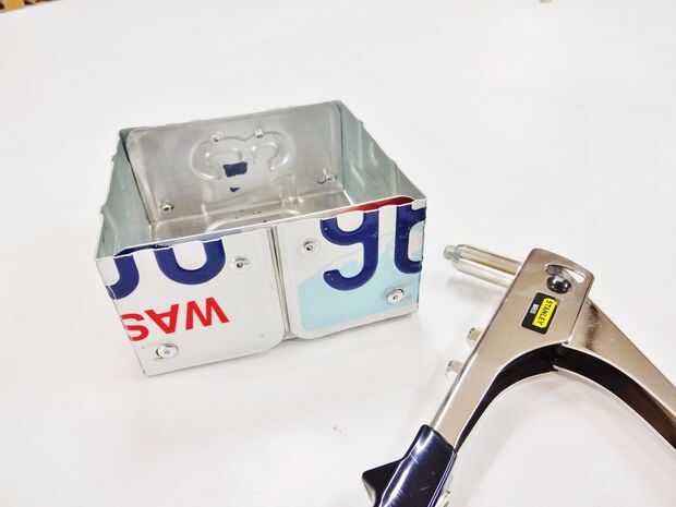 Utiliza una pinza para unir las piezas y utilizar un 3/16" bit para escariar a cada par de agujeros cerca-alineados según sea necesario, luego agregó un remache en cada punto. Luego perforar un agujero y había añadido un remache adicional a cada pestaña como se muestra en la foto de arriba.