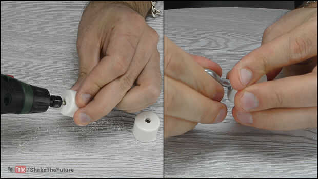 Taladré un agujero en una tapa de PVC para insertar un perno de ojo.