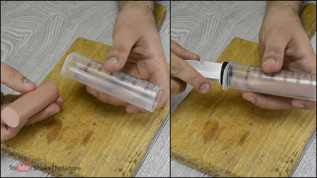 Poner en una salchicha y presione hacia abajo el émbolo.