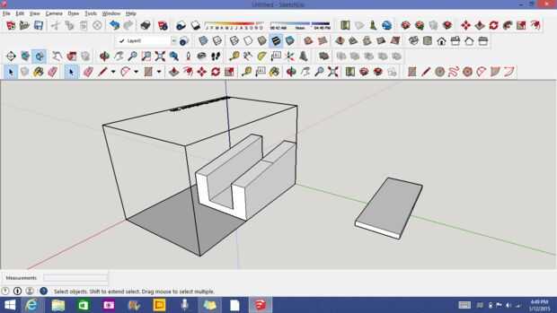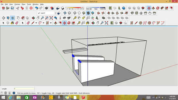 Ahora tenemos que terminarlo. Ahora seleccione las líneas azules en la imagen una que haga clic en la herramienta mover y mover el eje azul y que al azar tipo 1" y que presione Entrar. Hacer una línea de centro como en la segunda foto y que presione el botón de mover y que presione la parte superior de la línea central en la plataforma. Ahora baje el eje azul y que al azar tipo 1' y ahora imprimir y listo! Para trabajar lugar una canica en la plataforma y ver rodar cuesta arriba.