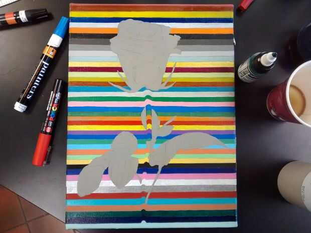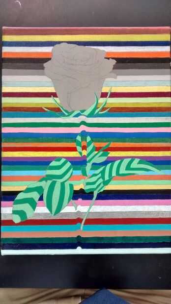 También, como se puede ver en mi pintura color de rosa, yo jugaba un poco con lo que arqueados y lo dejé en blanco. Realmente no tenía la intención de hacerlo cuando empecé, es justo lo que la pintura parecía dictar a mi como me funciono. En este caso arqueados del tallo de la rosa con las rayas del fondo, y luego cambió la dirección y sólo se utilizan dos colores de verde para las hojas. La flor floreciente decidí pintar tan realista como pude (que no es mucho).