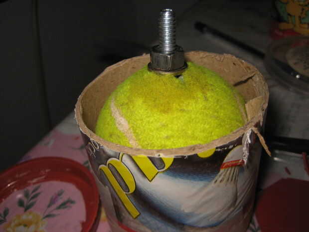 Corte hacia abajo para que cuando pones la pelota en, un segmento de él aparece desde la parte superior. Es decir, entre el radio y el diámetro de la bola. Más largo es el tubo, más restringido será el rango de movimiento. Por otro lado, si es demasiado corto probablemente a perder estabilidad. Creo que al final es mejor apuntar para 2/3 del diámetro de la bola.