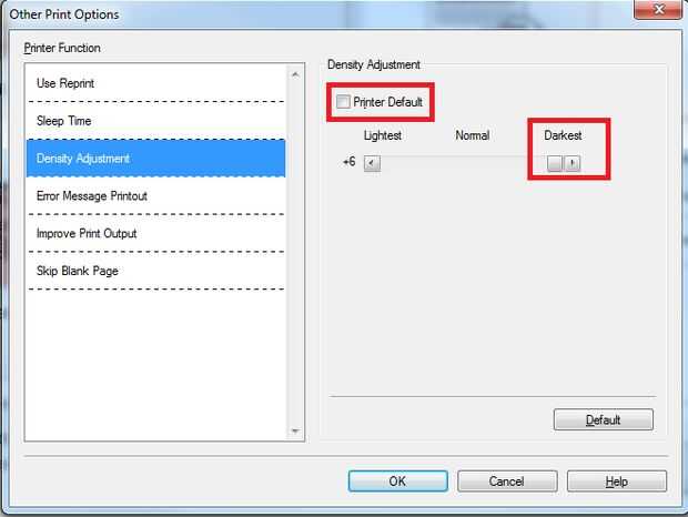 Con mi impresora, llegar a la configuración de densidad de impresión entrando en avanzado > otras opciones de impresión. Desactive la opción de impresora predeterminada y la densidad de la impresora del viento hasta al más oscuro.