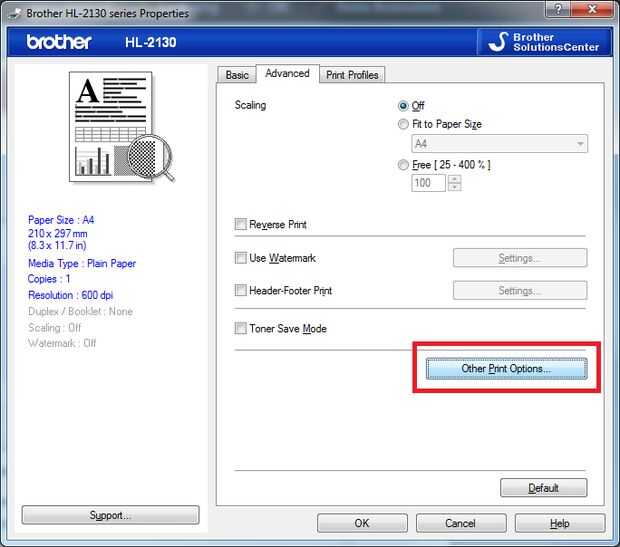 Tengo una impresora Brother HL-2130 y estoy usando Windows 7 Home Professional... así que probablemente usted tendrá que encontrar su propio camino alrededor en caso de que los ajustes no son la misma que la mía.