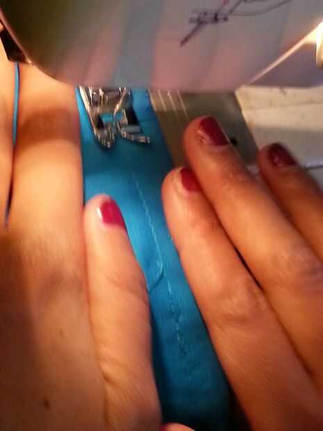 Coloque a la tela sobre la pieza del paso anterior y la puntada, asegurándose de que no coser demasiado lejos en la tela porque se necesita espacio para el lazo.