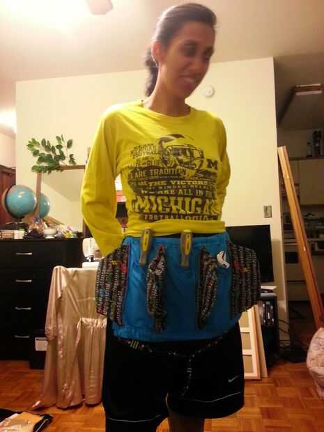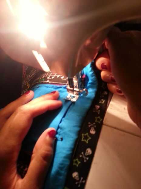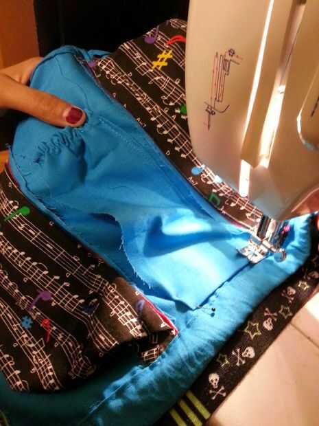 Doblar los bordes bajo y coser los lados excepto en la parte superior elástica para la tela azul entre los bolsillos con cremallera.