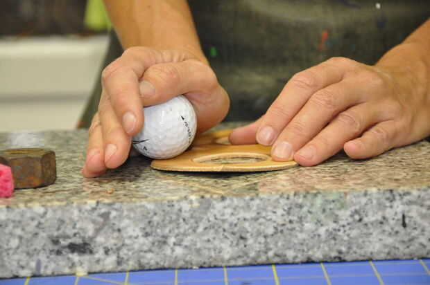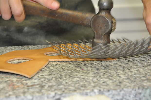 Esta es la parte! Siempre estoy a la caza de cosas que añadir textura interesante a cuero. Para aplicar, simplemente humedezca la superficie de cuero liso, esperar un minuto o dos para que seque otra vez un poco y luego martillo algo en él o rodar una pelota de golf sobre algo como el acoplamiento de alambre, pantalla, Desma, soling, cualquier cosa que usted puede encontrar que crea una textura que te gusta. No te preocupes si no es demasiado audaz, su pintura o tinte ayudarán a llevar a cabo.