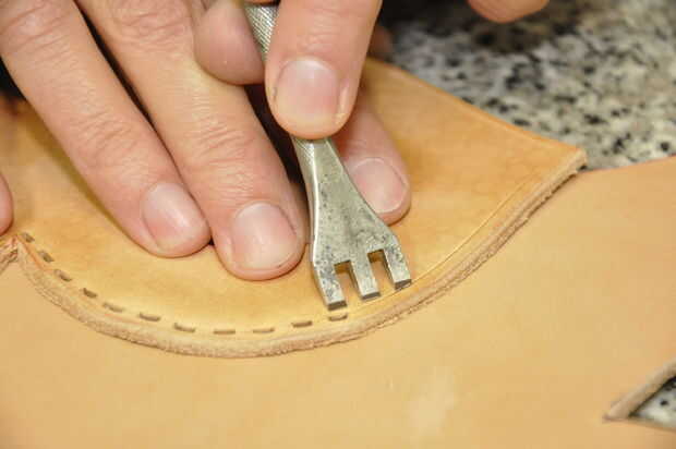 Utilizar un divisor de ala para trazar el borde de la piel para saber dónde colocar el cincel cuando estoy haciendo los agujeros de costuras. También puede conseguirlo lo echando un vistazo o usando un clavo o algo puntiagudo que haga una mella.