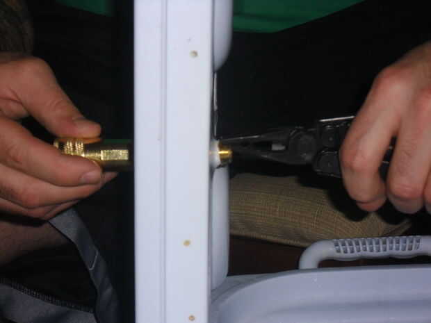 A continuación coloque la rápida desconexión. Usted necesitará dos pares de alicates para esto. Uno para sujetar el pezón en su lugar, la otra para apretar el desconector rápido.