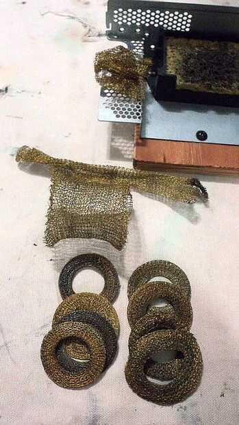 Tengo una colección de malla de latón de antiguos hornos de microondas que tira. Para su uso en este proyecto, I ampliar el tubo, cortar por la mitad y formar un pliegue de zig-zag y fíjelo al soporte con una grapa de alambre de cobre. Cuando ya no utilizables, repita el proceso. Sospecho que la lana de bronce regular en mi futuro, distante, pero no es si las microondas siguen llegando por. Las esponjas son desechos de la cocina cuando la esposa dice que es hora de ir. Un cocinero de amortiguación y rápido durante varios segundos en el microondas mata las bacterias malolientes, ahora están listos para dar un servicio de segunda. La bandeja de esponja vino de... en algún lugar, donde ahora se me olvida, pero cabe perfectamente la necesidad.