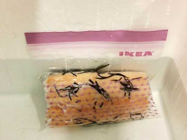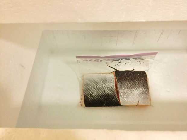 Cubrir la caja del refrigerador y esperar! Compruebe detrás cada 10 minutos o así para ver si la temperatura ha bajado demasiado. La idea es que toda la pieza de pescado para alcanzar equilibrio, a cualquier temperatura que ha predeterminado le dará la textura cocida ideal. 50 grados centígrados le dará una textura lisa sedosa, un poco rara. Nos fuimos de 55 grados como lo queríamos sólo medio bien a través de y.