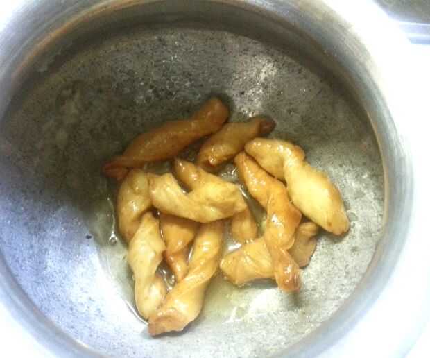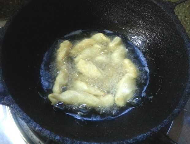 En una sartén calientan aceite en alto calor y una vez que el aceite es climatizada bergantín el calor hacia el medio. Freír las piezas trenzadas uniformemente por todos lados y hasta que es marrón claro. Manténgalos en un lugar seco mientras se prepara el jarabe de azúcar.