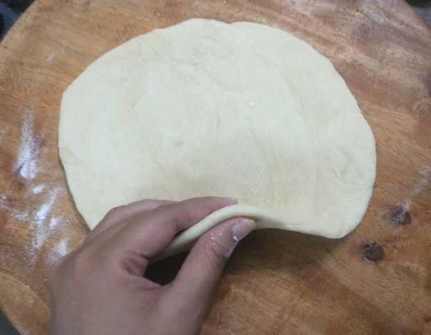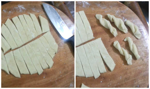 Corte el roti en pequeños trozos, como se muestra en la foto de este paso. Tomar cualquiera de las piezas y retorcerlo, presione los extremos para garantizar el giro. Del mismo modo torcer las otras piezas.