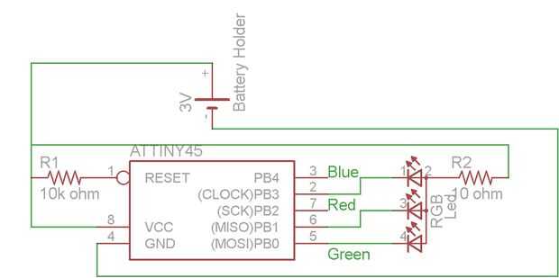 El código es casi el mismo y, en mi opinión, más fácil de leer. Puede descargar el en la parte inferior. Esta vez ofrecemos que un PWM pin para cada pin de conexión a tierra en el LED RGB. De esta manera nos a tierra a través de la viruta. Voltios pueden medirse como la diferencia entre dos puntos.